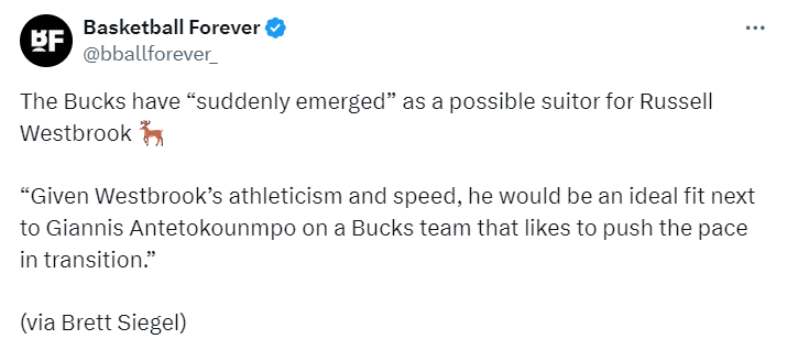 “威斯布鲁克与保罗、布罗格登以及其他仍在自由球员市场上的后卫一起,都在雄鹿的评估范围内。”